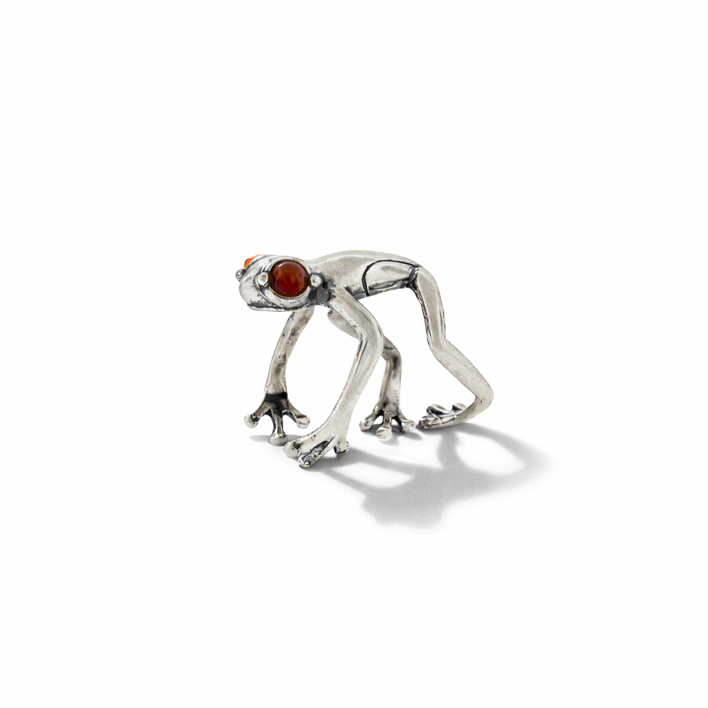 Anillo ajustable en forma de rana saltarina, sus zancas abrazan el dedo.