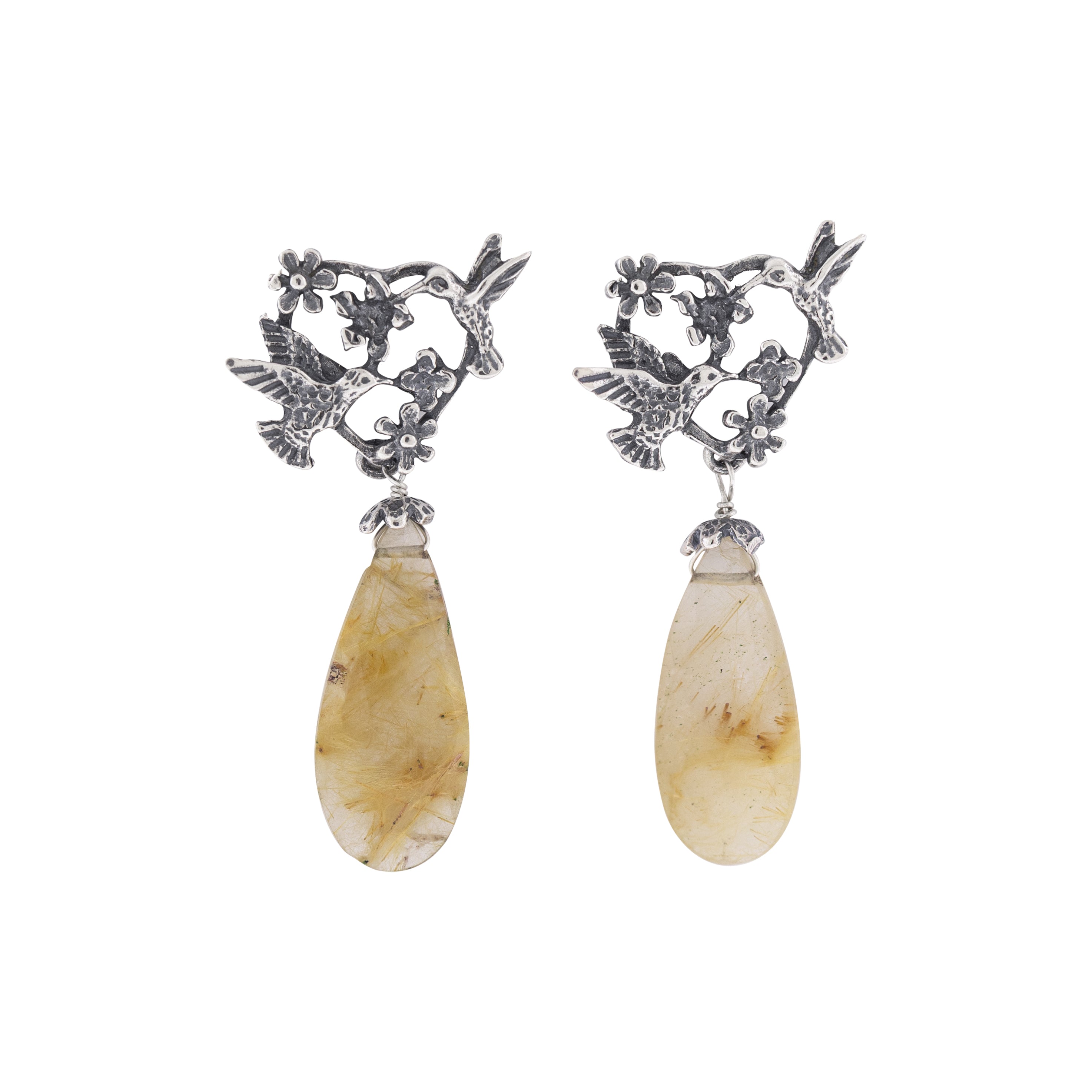 Aretes de poste con piedras colgando, forma de corazón con colibríes y flores.