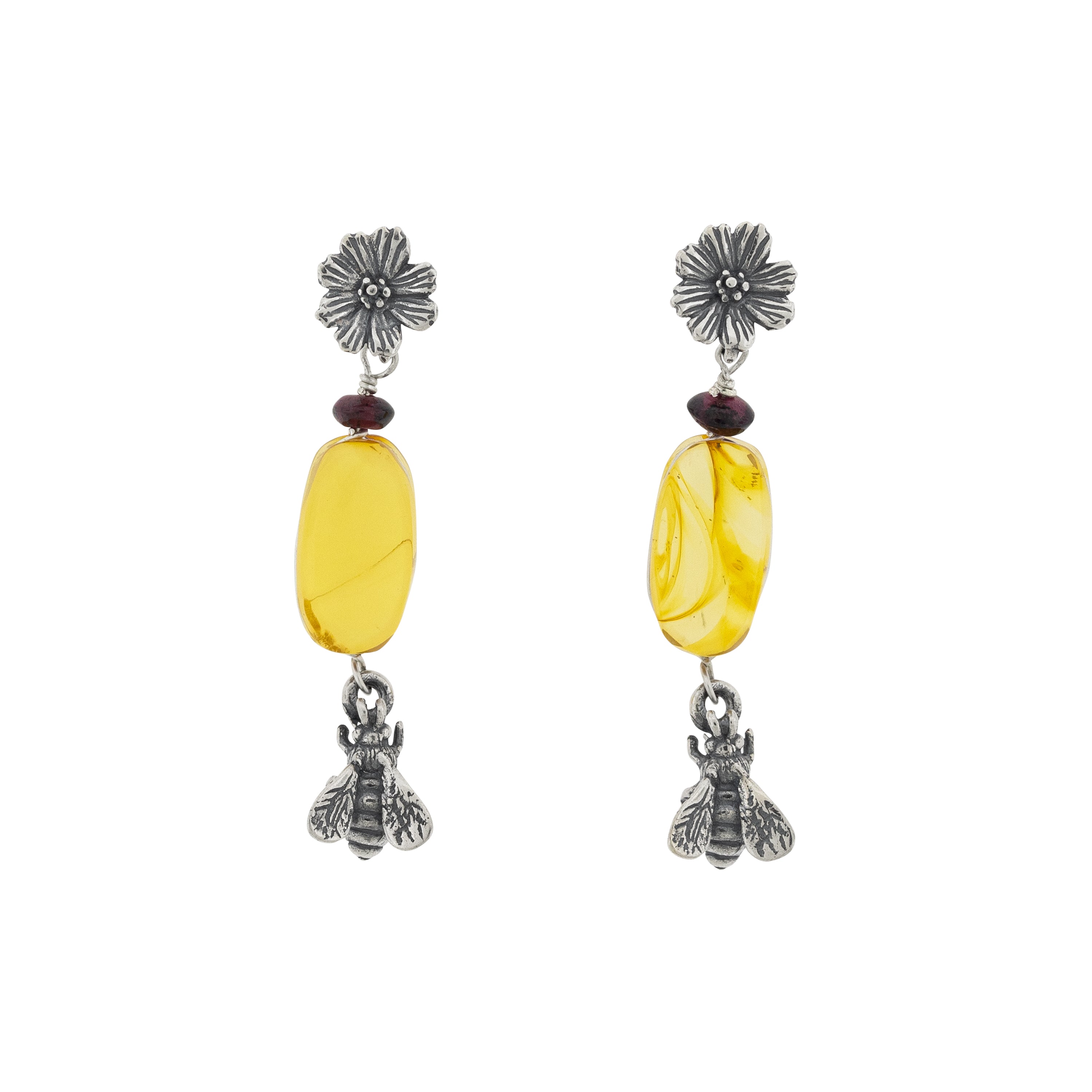 Aretes de poste de abeja con margarita de plata pavonada 925 y un óvalo de ámbar.