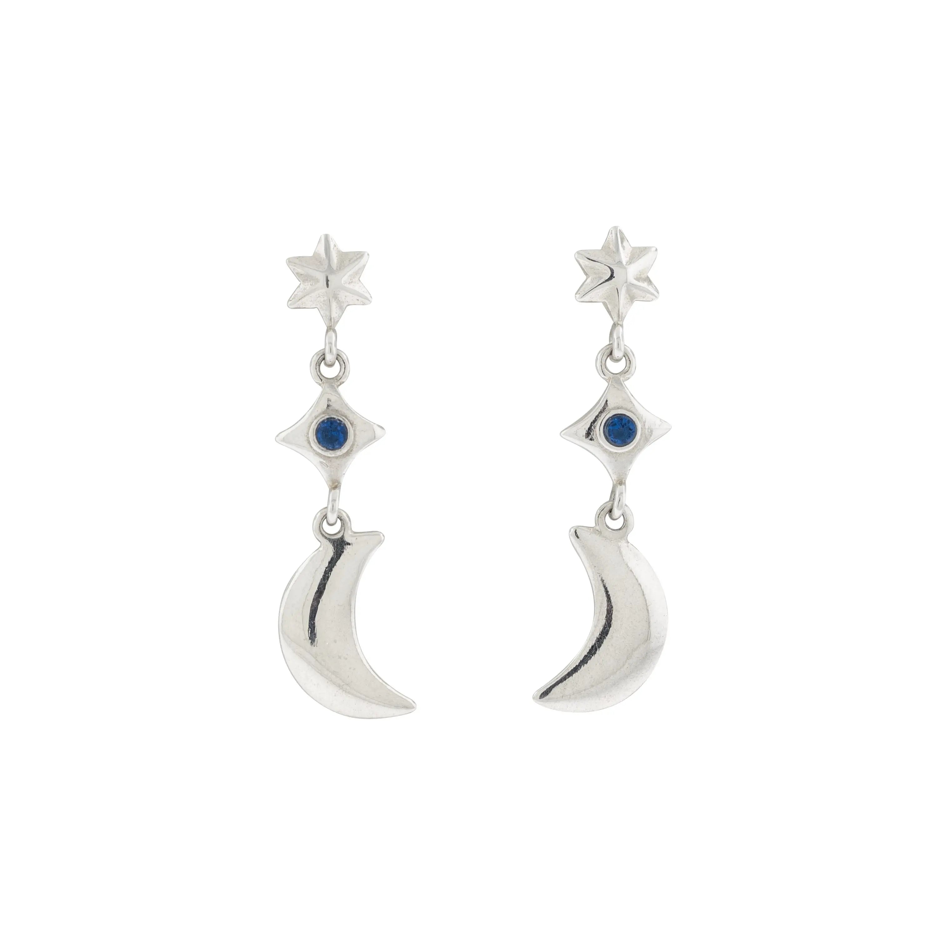 Aretes de lunas, destellos y estrellas que parecen guardar la memoria del cielo después de la lluvia. Tonos azules como el misterio, de la noche para quien sabe que la noche también cuida, también canta y también guía.