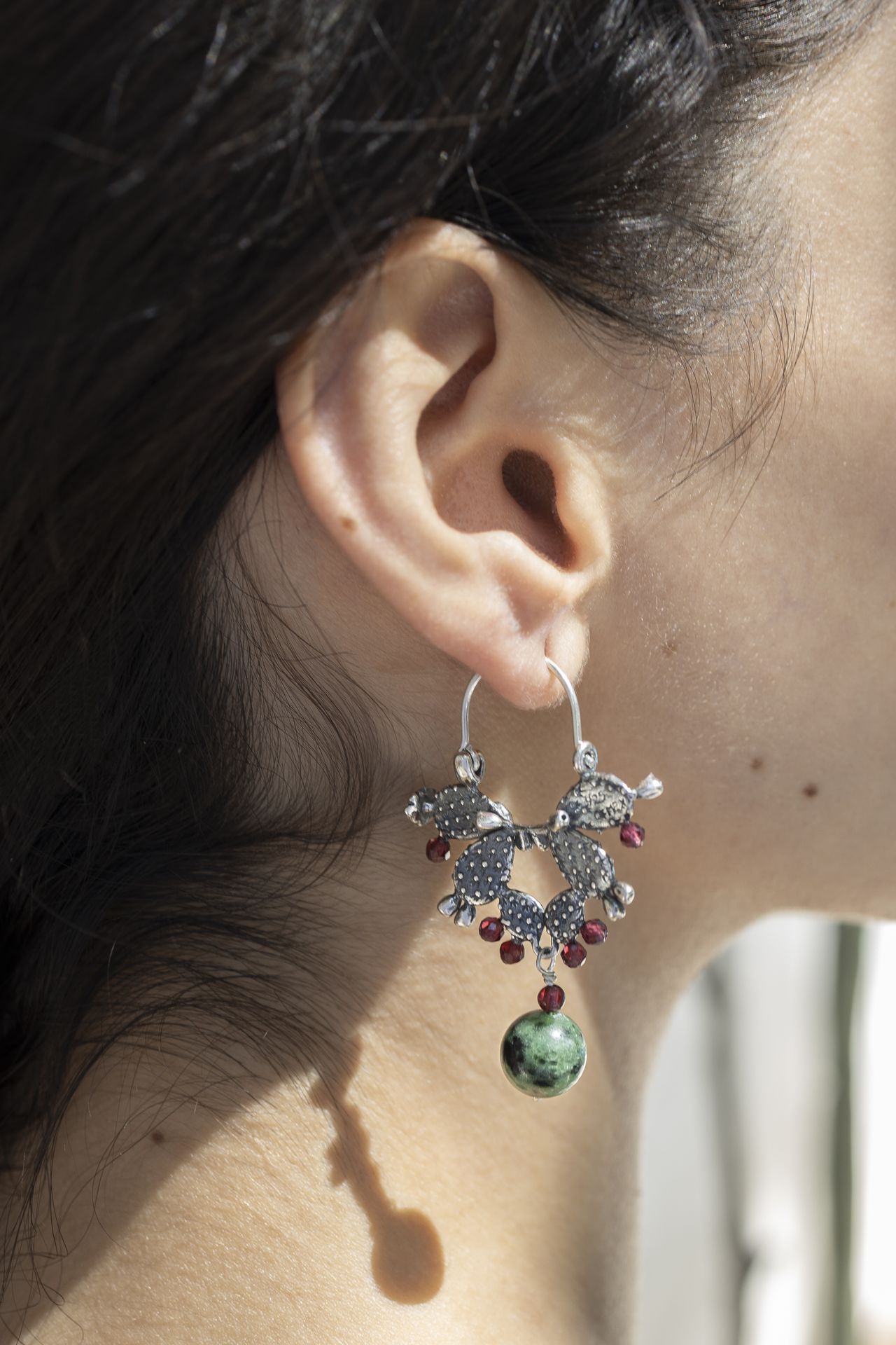 Arracadas de nopales con tunas de granate y piedras colgando.