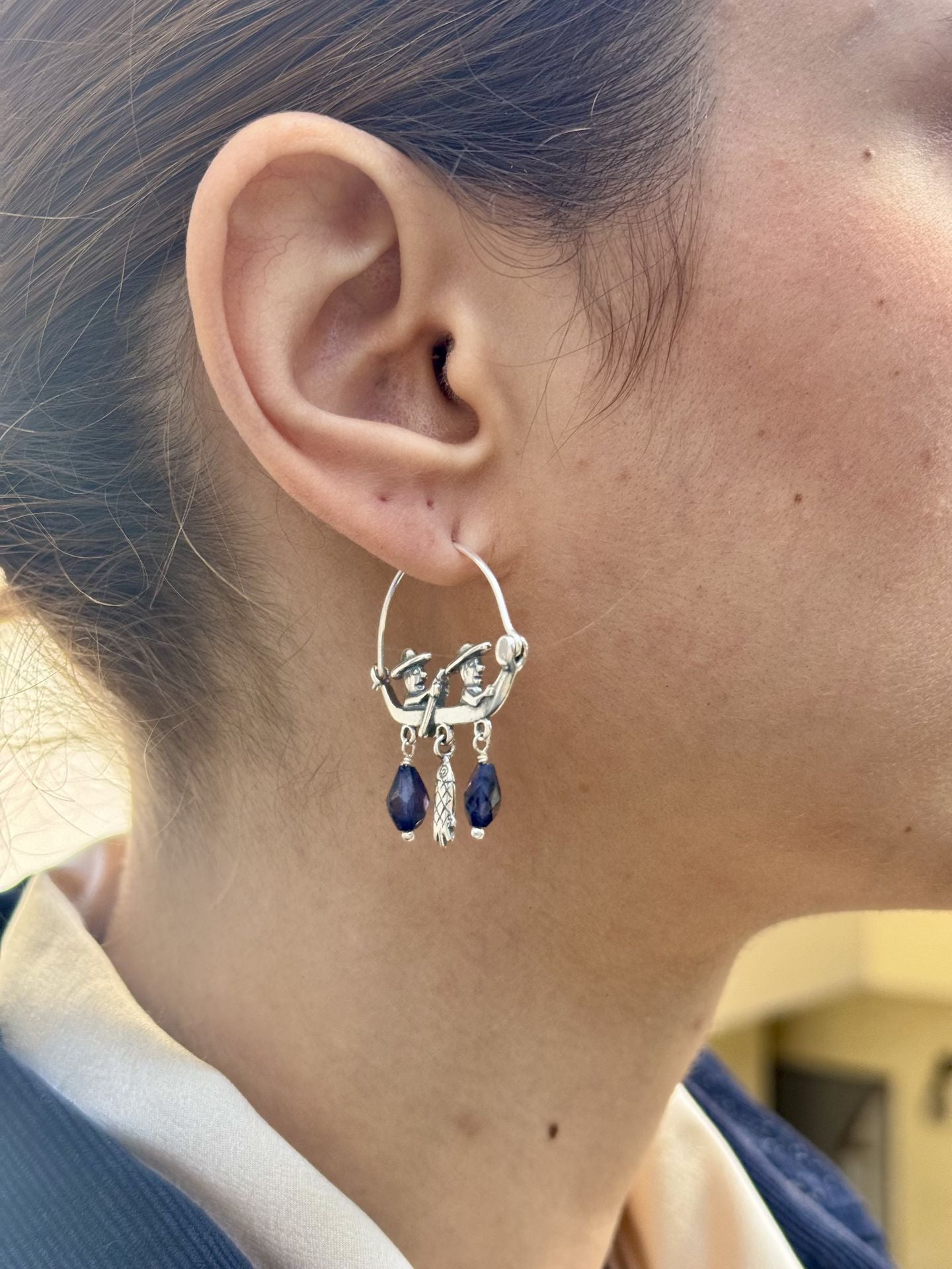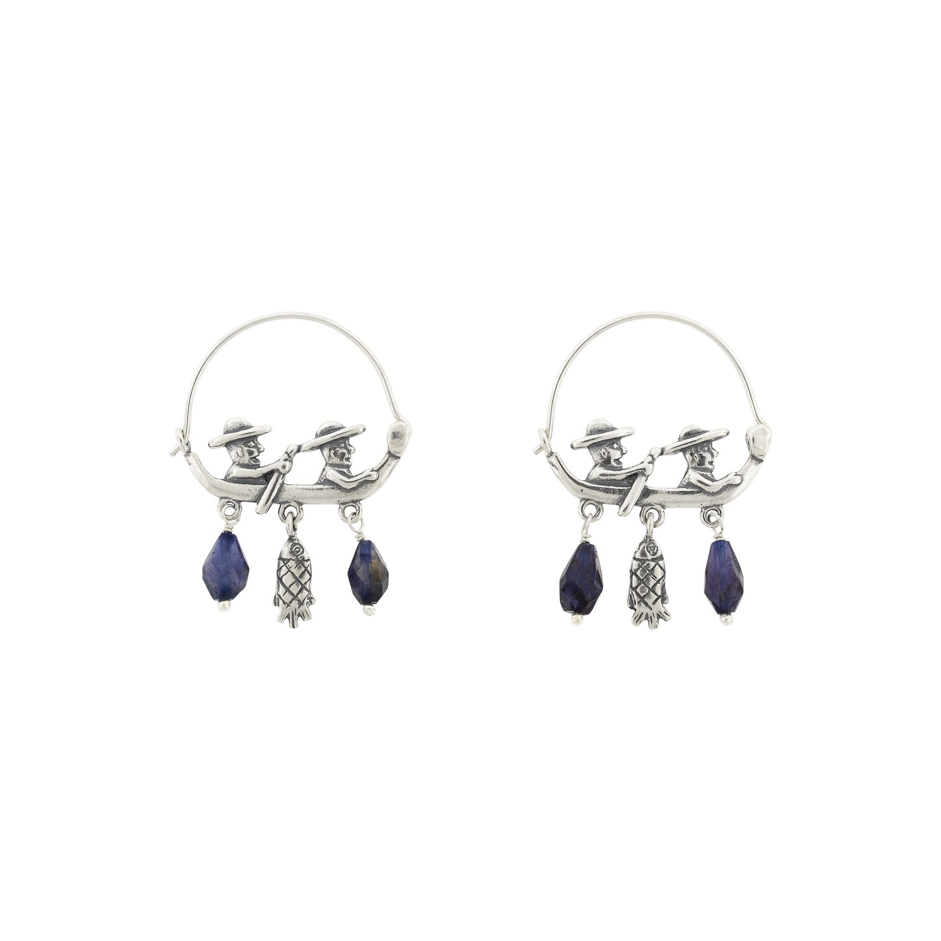 Inspiradas en los pescadores del lago de Pátzcuaro que reman con paciencia y oficio. Estas arracadas reinterpretan un símbolo tradicional del imaginario mexicano. Están hechas de plata 925 con dos iolitas que añaden luz y movimiento a la pieza, como destellos sobre el lago al amanecer. Estas arracadas son un homenaje al trabajo compartido, a la conexión con la naturaleza y a las historias que se transmiten de generación en generación. Un clásico de Citlali renovado, que lleva en su forma la memoria del agua, el ritmo del remo y la dignidad del trabajo hecho a mano.