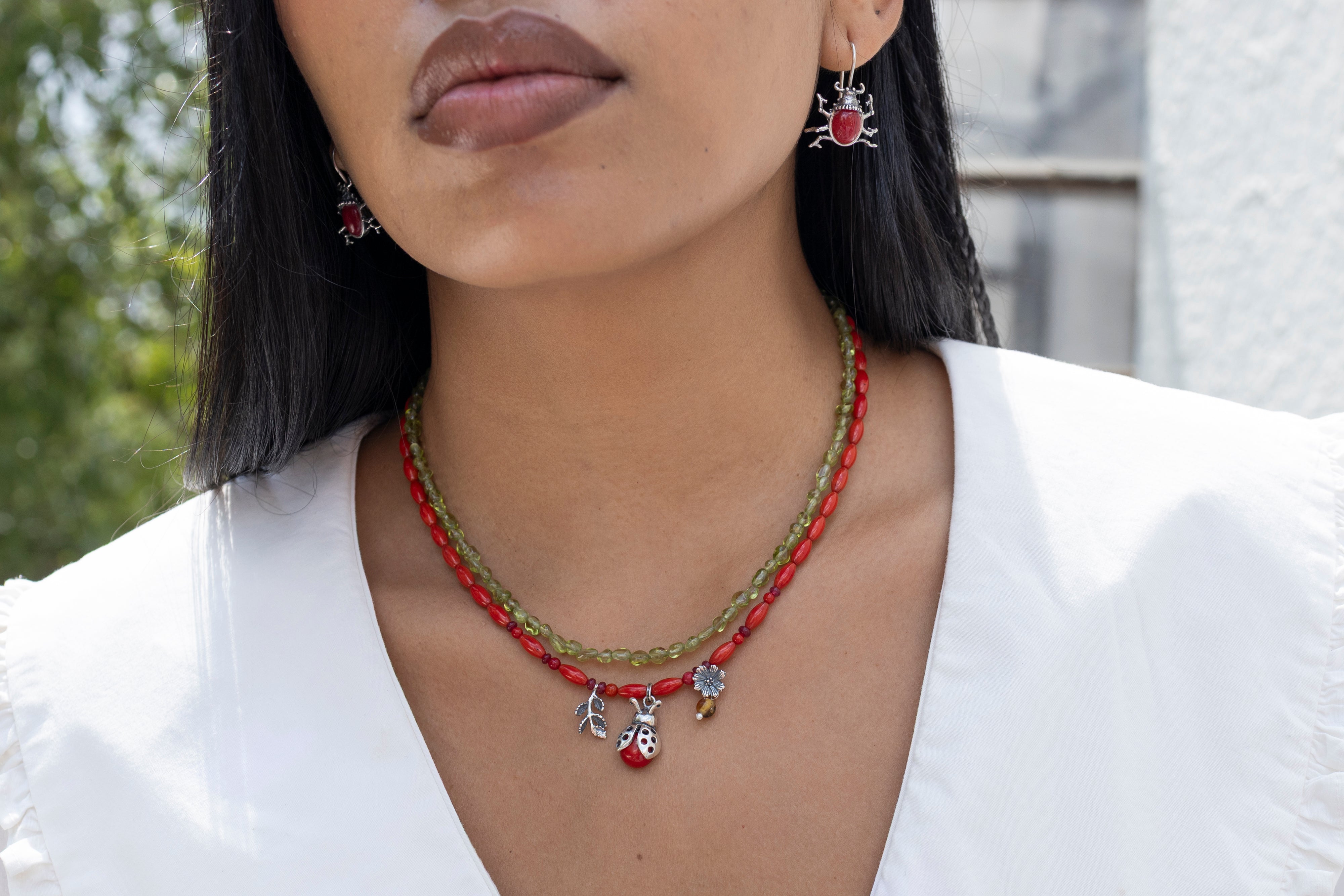 Este collar tiene dos hilos de piedra, agata rojo y peridoto con figuras y broche de plata 925. La Catarina tiene un coral en su pancita.