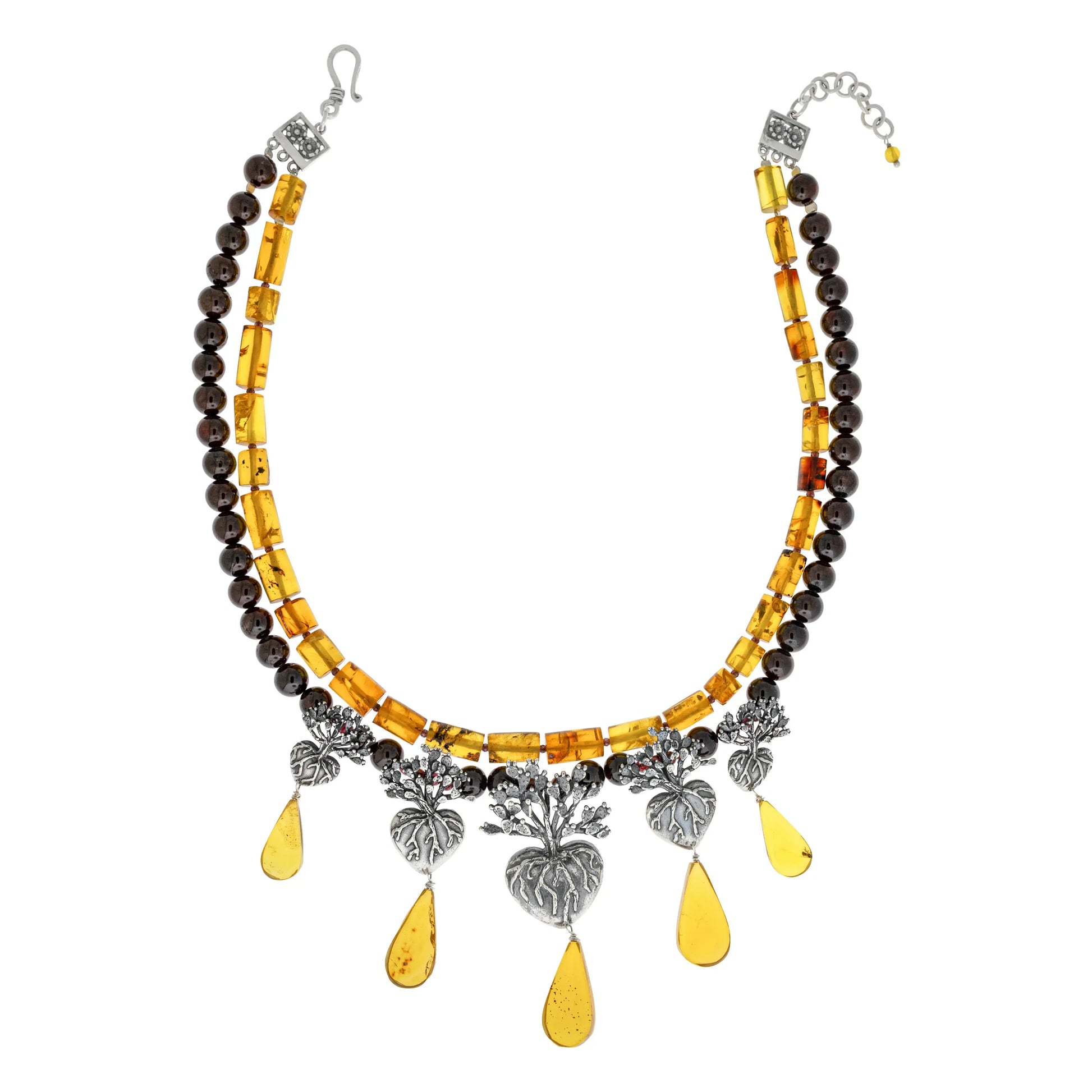 Este collar celebra a quienes llevan a México en el corazón. Cinco dijes de nopal en distintos tamaños están enraizados en el corazón, este diseño habla de identidad, pertenencia y amor profundo por la cultura que nos forma. Les cuelgan unas grandes gotas de ámbar que, con su color amarillo, nos recuerdan la energía del sol que nos llena de vitalidad y fuerza para sortear todos los obstáculos.