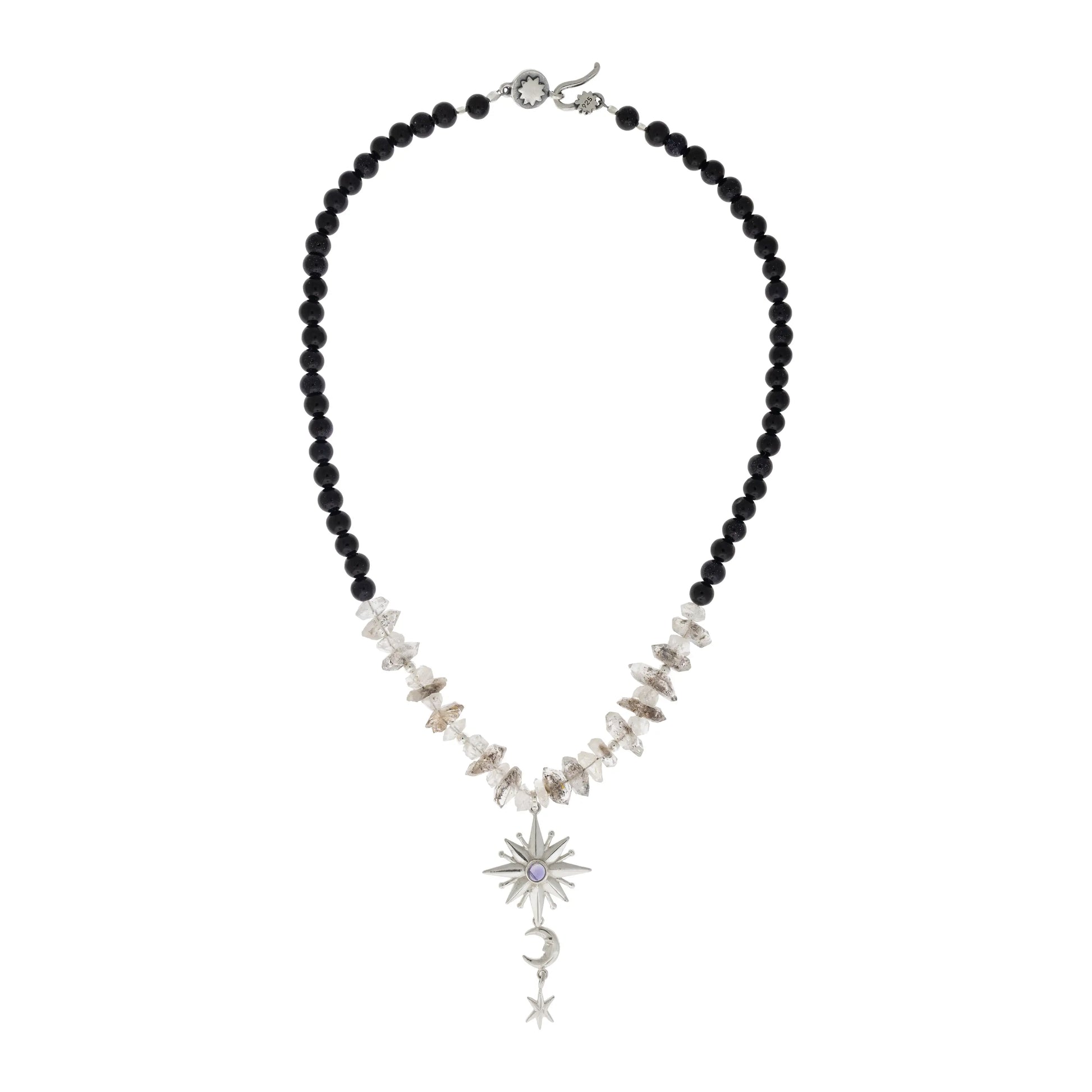 El collar tiene cuarzos herkimer y ónix con piezas de plata 925.