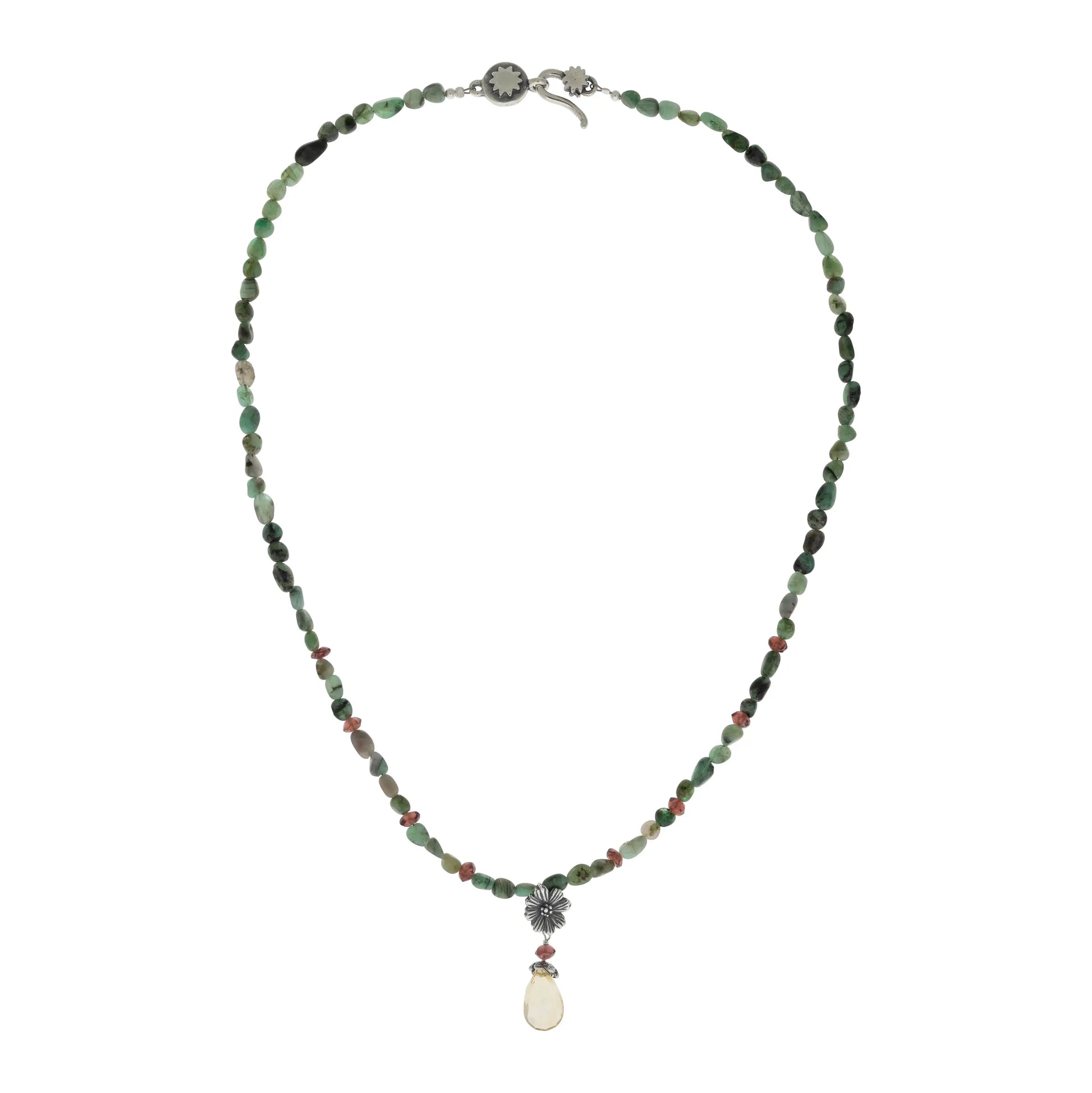 Collar delicado y lleno de vida con esmeraldas que aportan el pulso verde de la renovación —esa sensación de volver a empezar con calma. Tiene unos toques de granate son el calor discreto del corazón, la fuerza que sostiene lo que es verdadero. Del centro nace una flor: sencilla, clara, sin adornos innecesarios, de donde cuelga una gota de citrino, como una luz tibia que cae suave sobre la piel. Este collar es una invitación a la serenidad luminosa: la belleza que no necesita imponerse para ser vista. La presencia que se siente antes de mirarse.