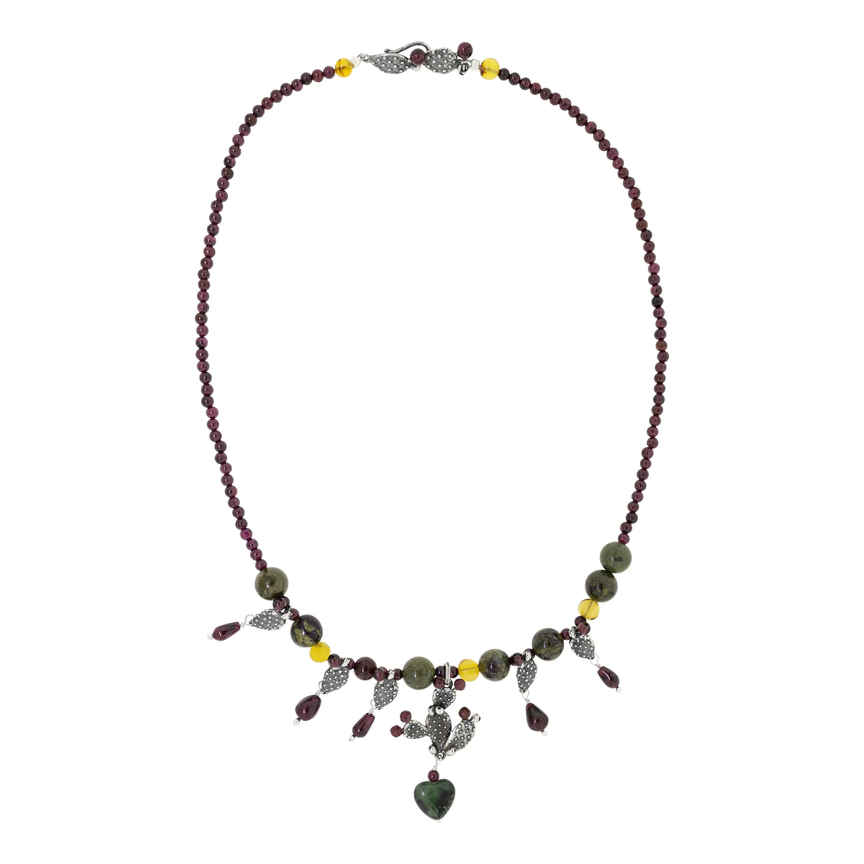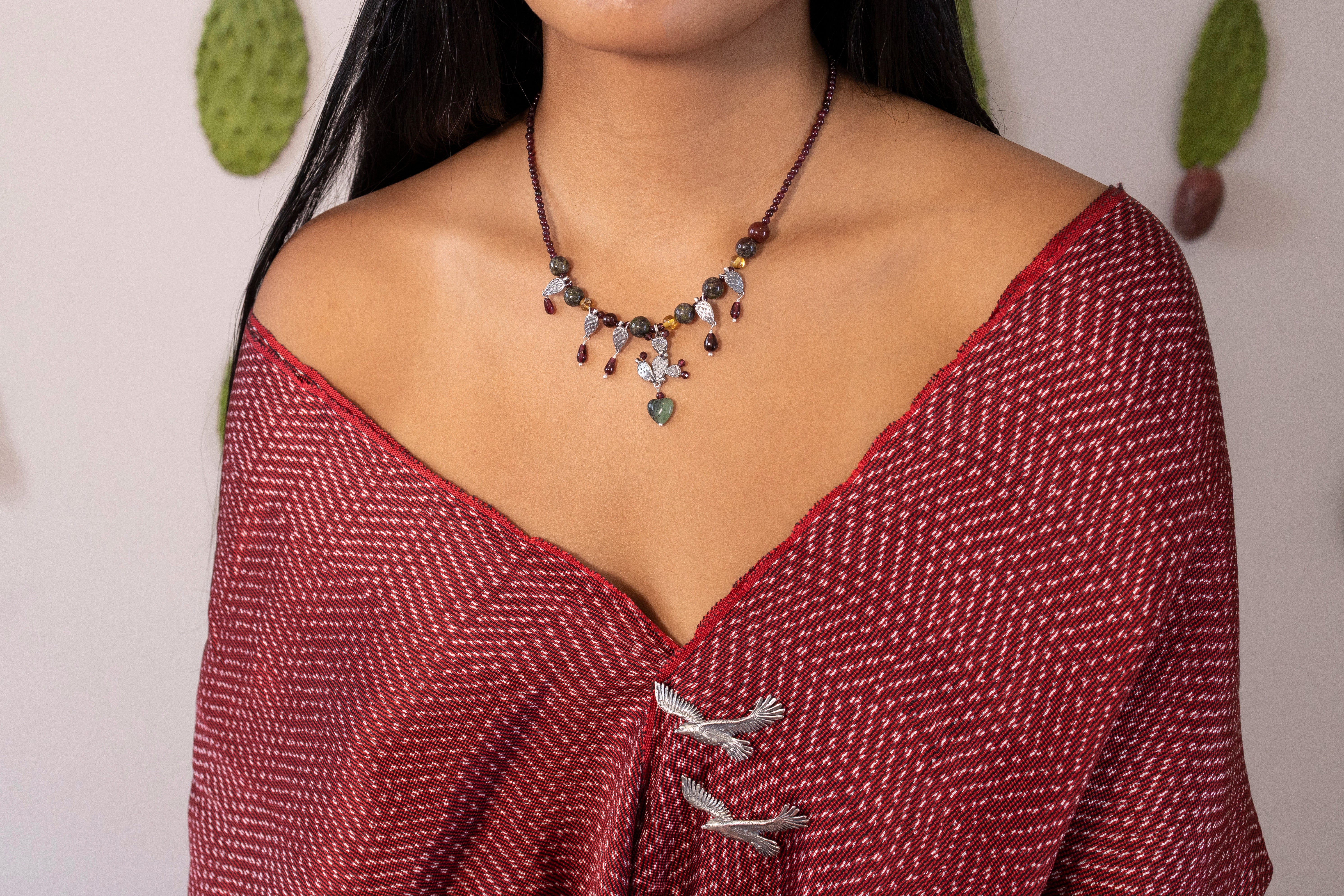 Porque tener un nopal no es suficiente. Con sus nopales de plata con tunas de granate, envuelto en ágatas y ámbar, el Collar de Nopales sencillo viene a mostrarte que enaltecer nuestras raíces puede ser atractivo y deslumbrante. Combínalo con colores cálidos para resaltar su belleza.
