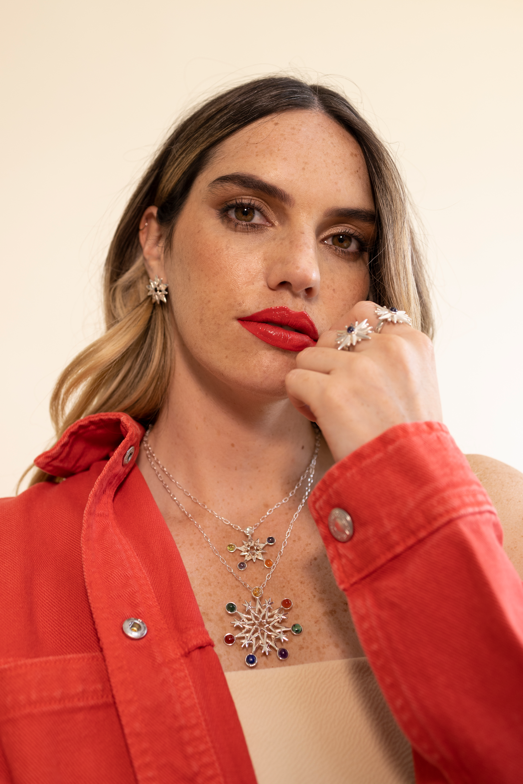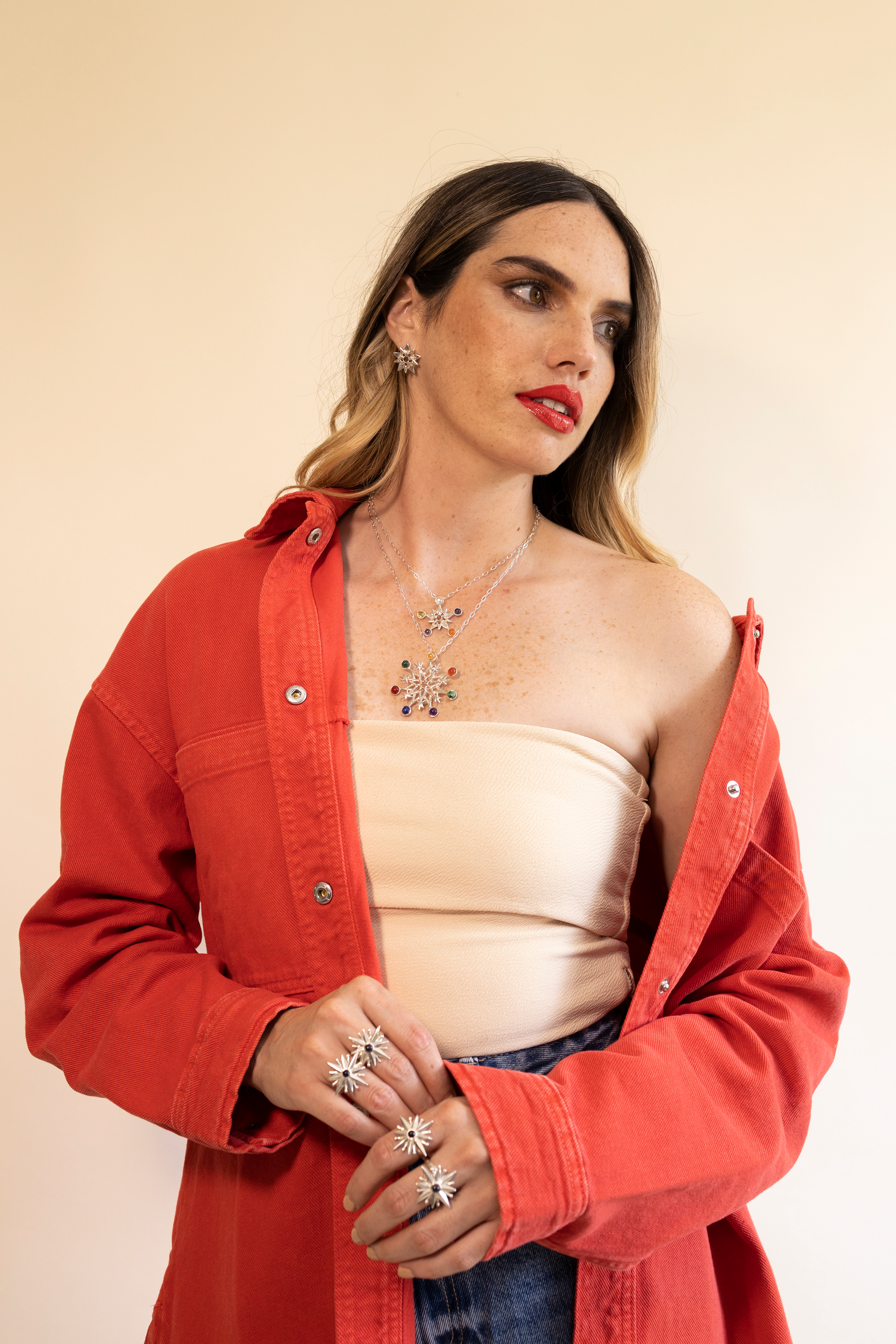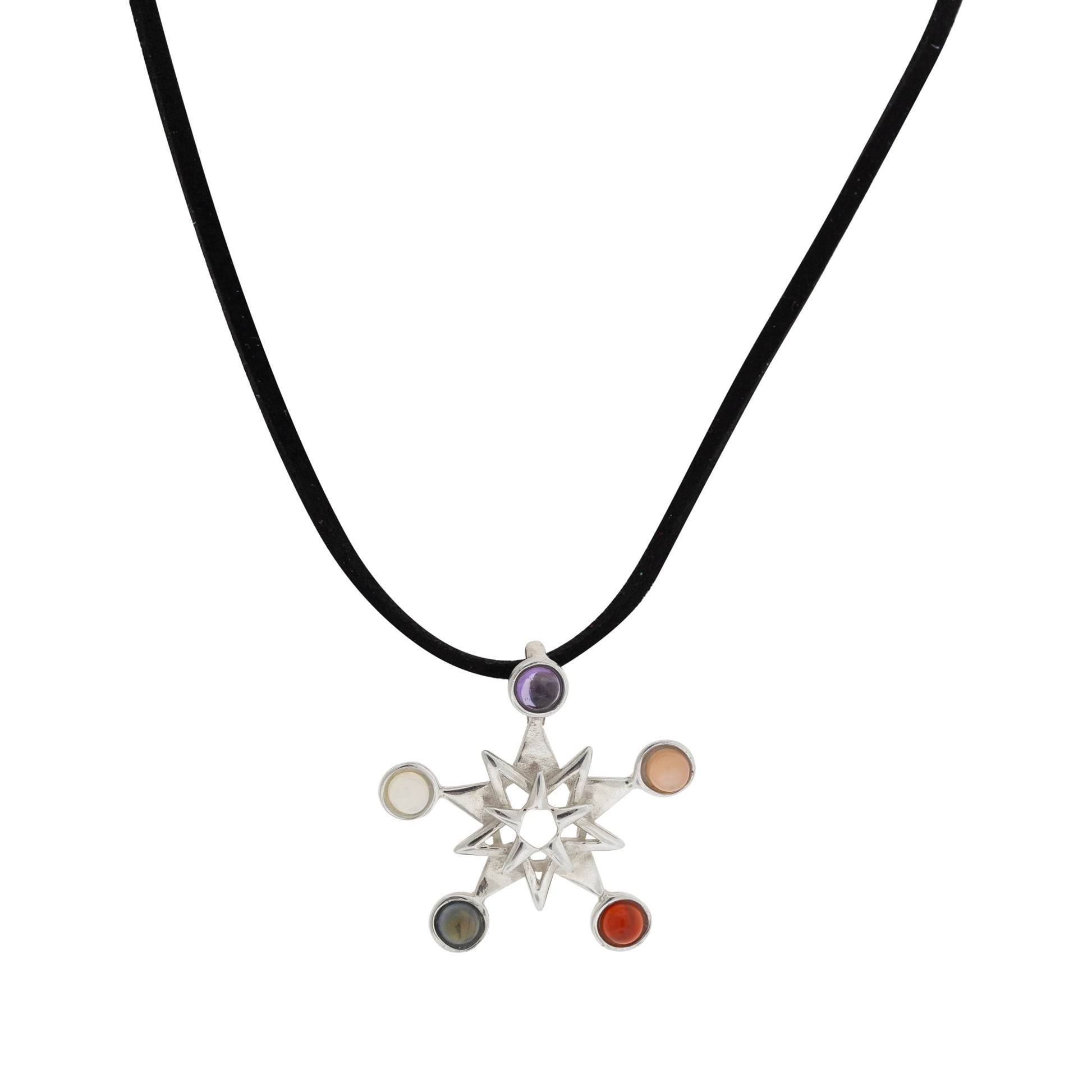 Las estrellas brillan en el cielo y su luz se refracta en tonos multicolores. Dije chico de plata .925 con piedras naturales variadas para usarse con una cadena larga o corta, dependiento de tu atuendo. Luce hermoso acompañado del dije grande de destellos multicolor.