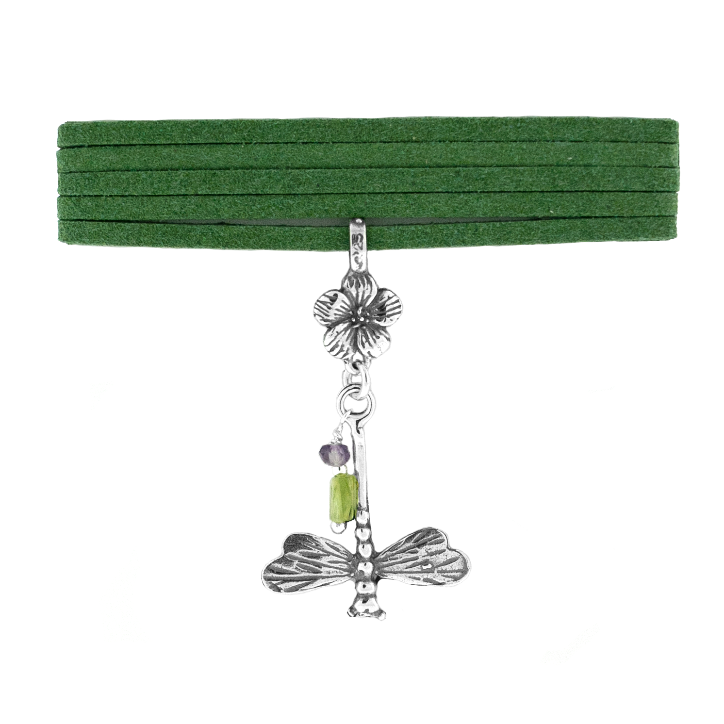 Dije con diseño de libélula y flor montadas sobre gamuza.