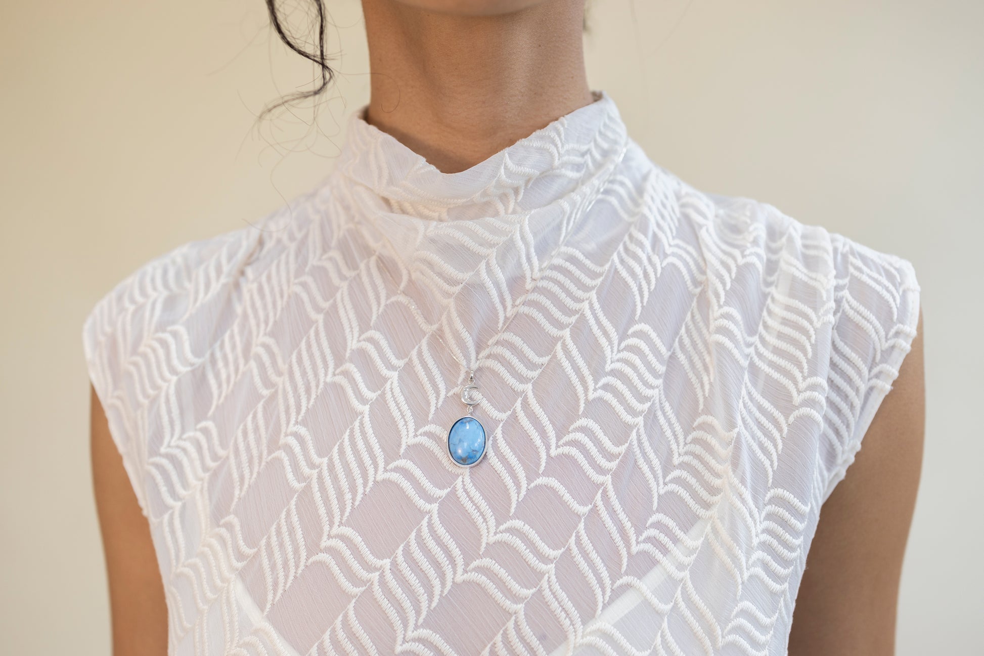 Dije de luna con cadena y bisel de plata con una piedra de turquesa tratada de un azul hermoso.