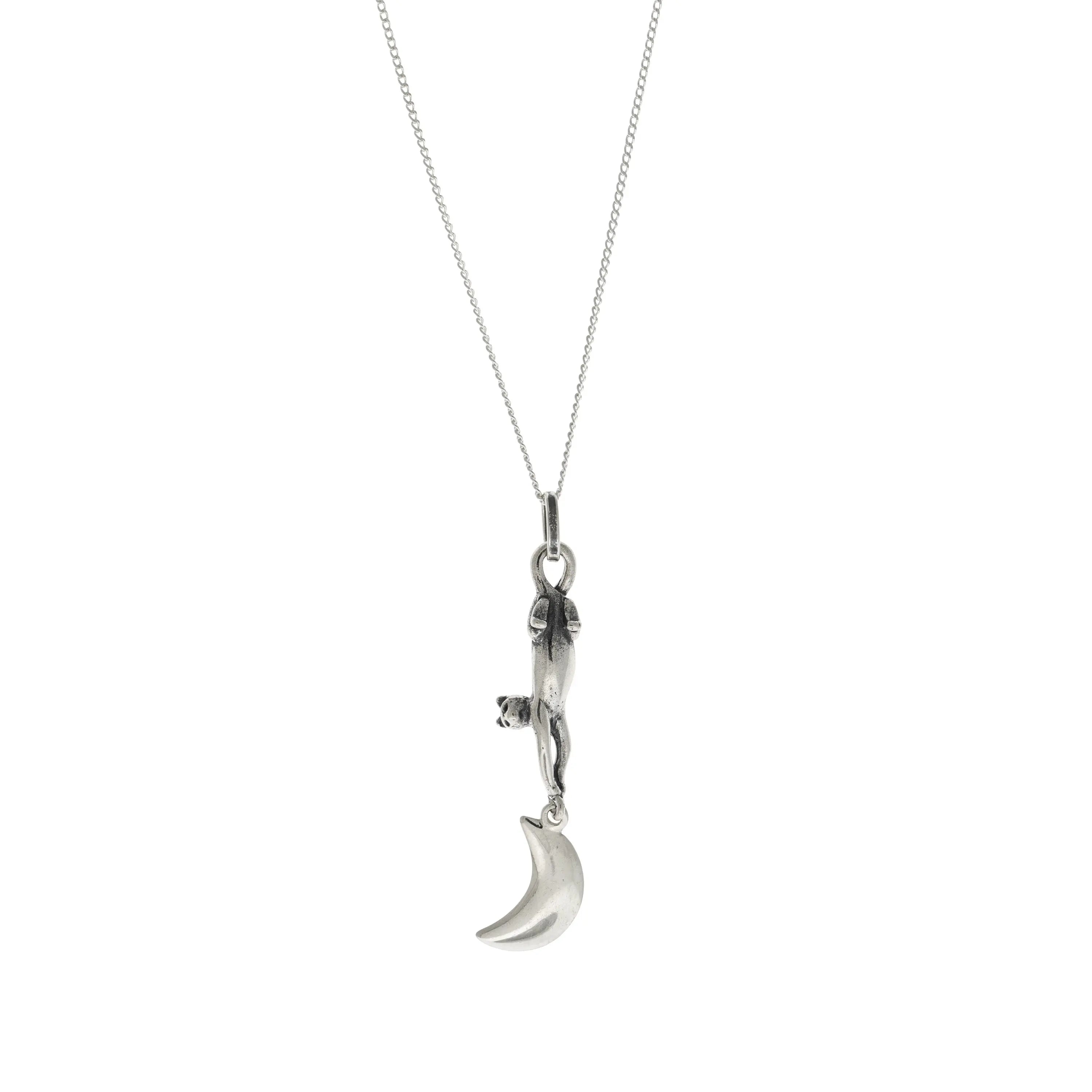 Dicen que la luna es inalcanzable pero un gato no cree en límites. Una noche, al verla flotando en el cielo, decidió dar un salto. Una joya para quienes aún se atreven a soñar, y saltan… incluso si la luna parece lejos. Dije de plata brillante con cadena.