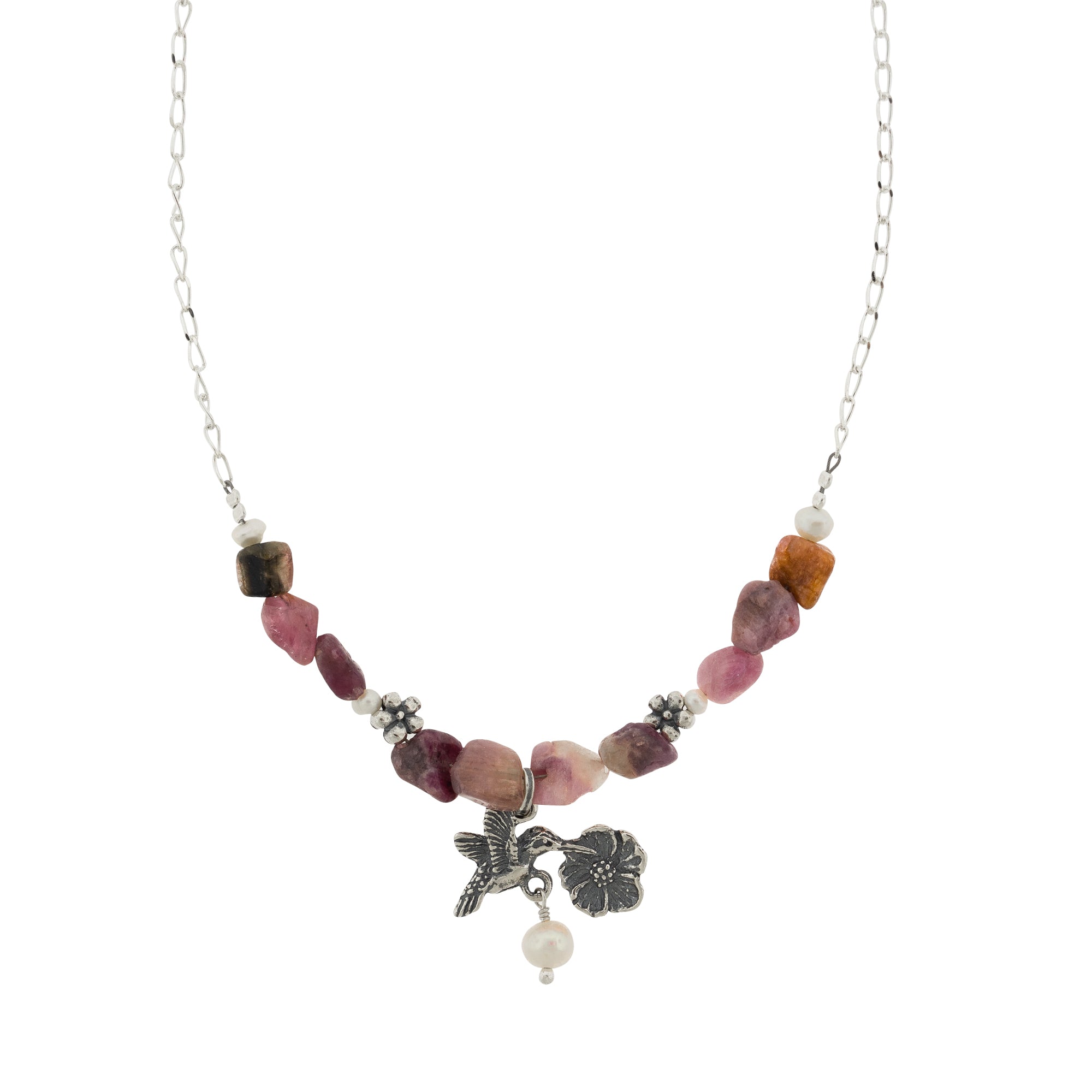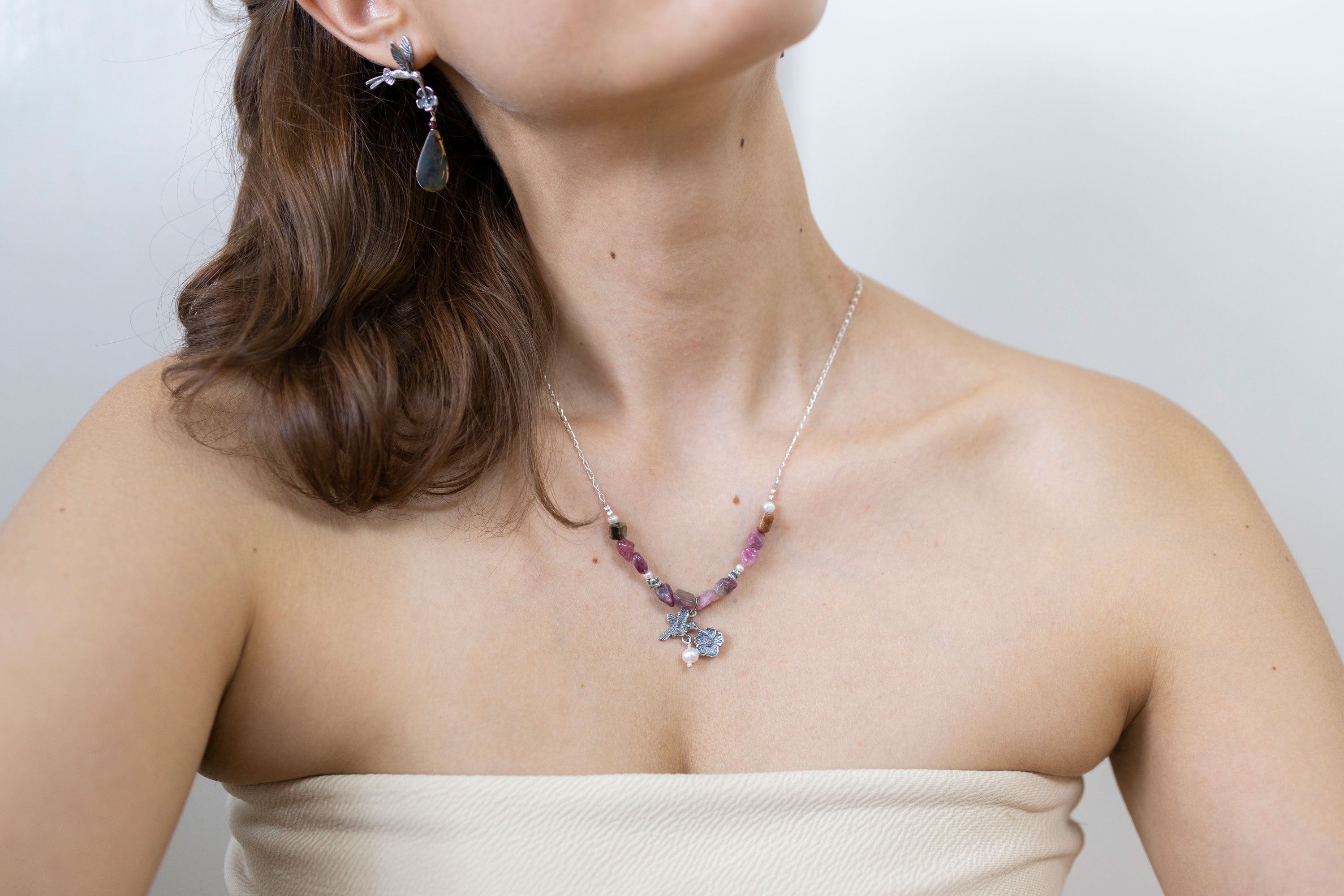 Este colibrí es de los favoritos de Citlali. Es una delicada gargantilla con turmalinas irregulares a la que le cuelga un colibrí con flor de plata y una perla.