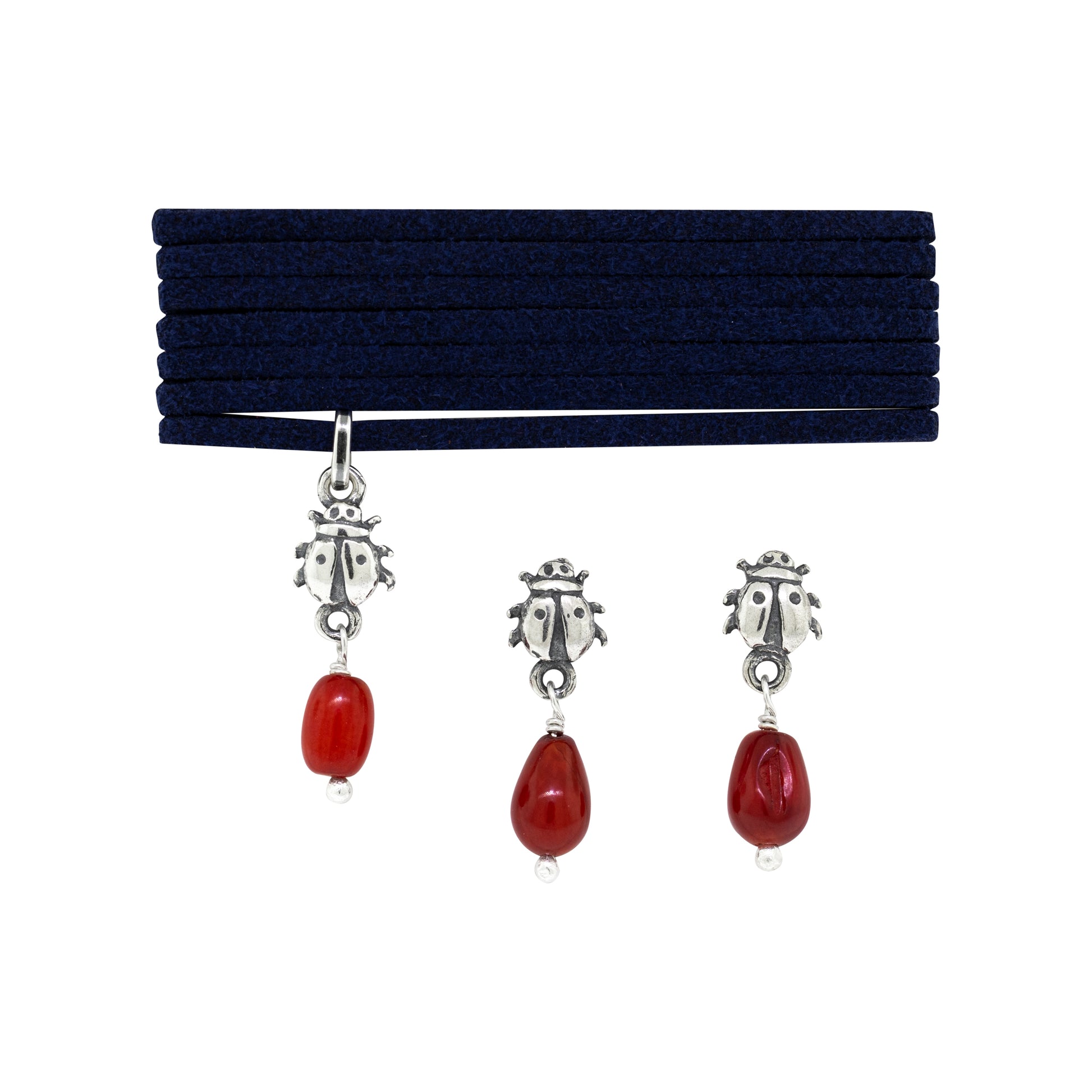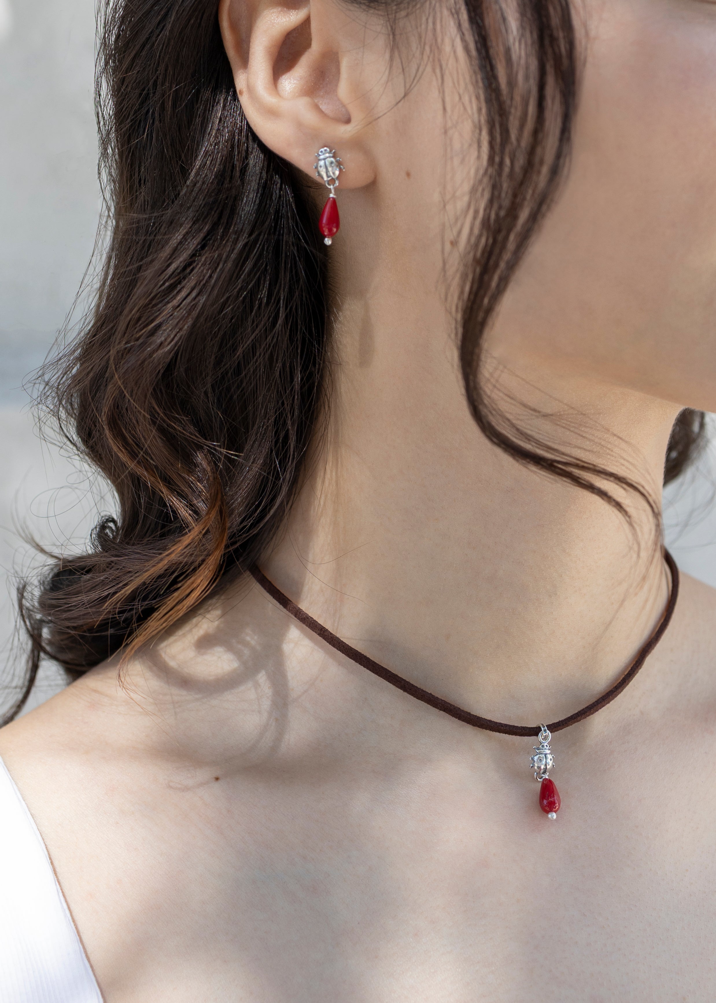 Juego de aretes de poste y dije de catarinas con piedra ágata rojo.