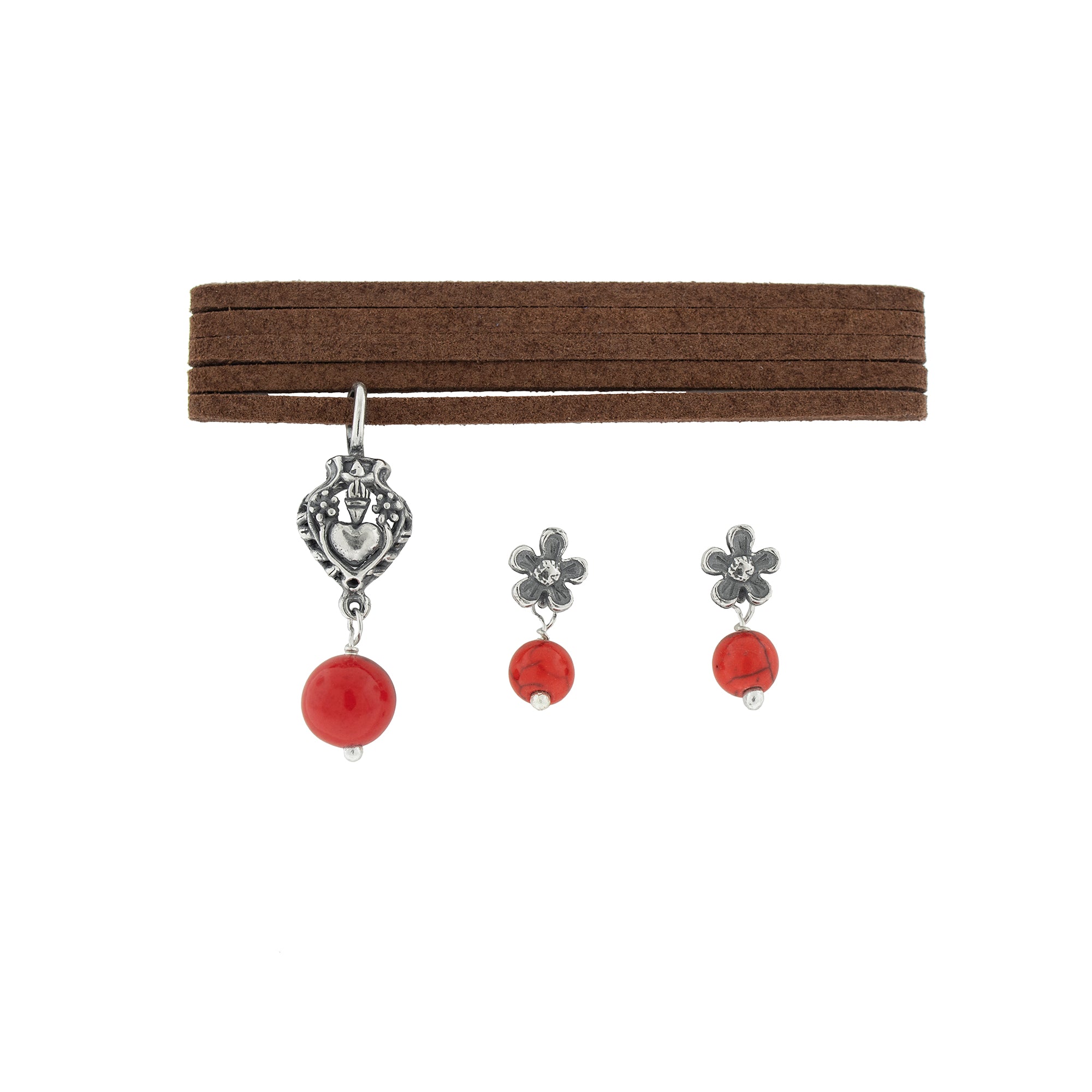 Juego de dije con diseño de corazón eterno y aretes de florecita con piedras colgando.