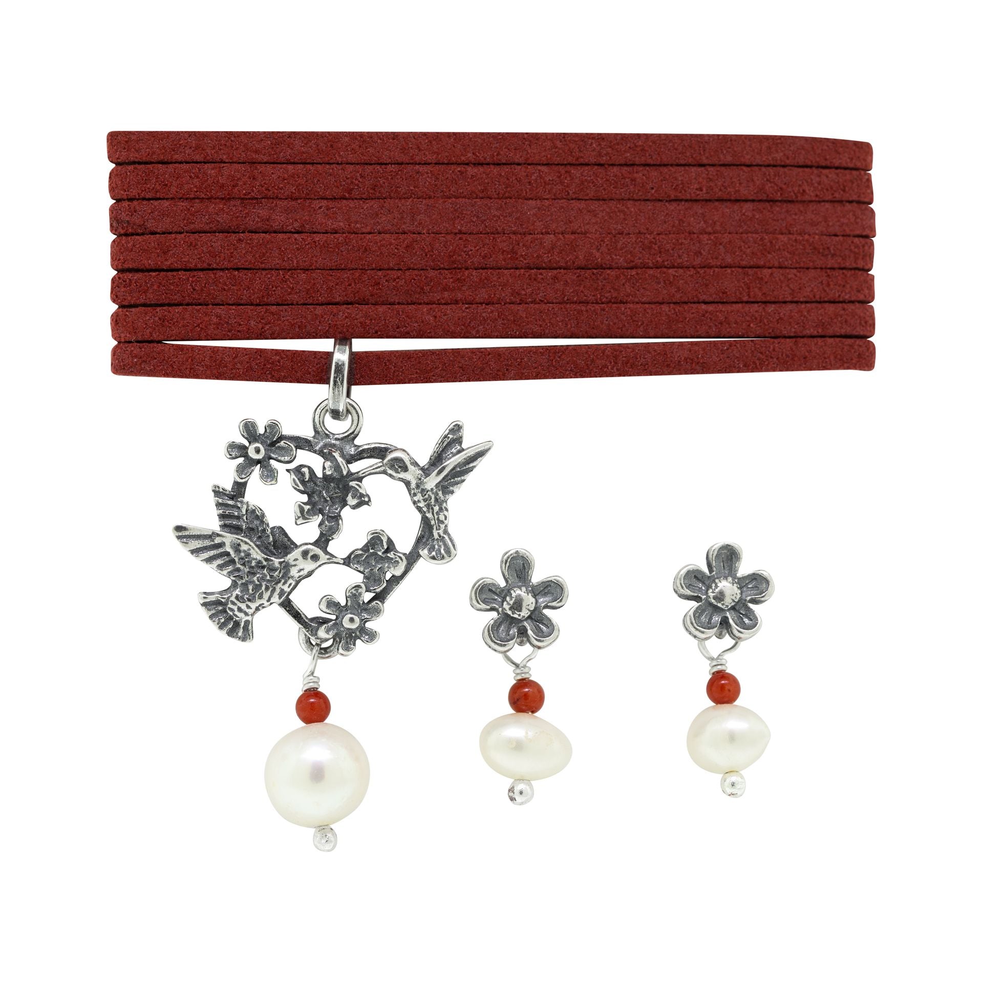 Juego de dije y aretes de plata con diseño de colibríes enamorados.