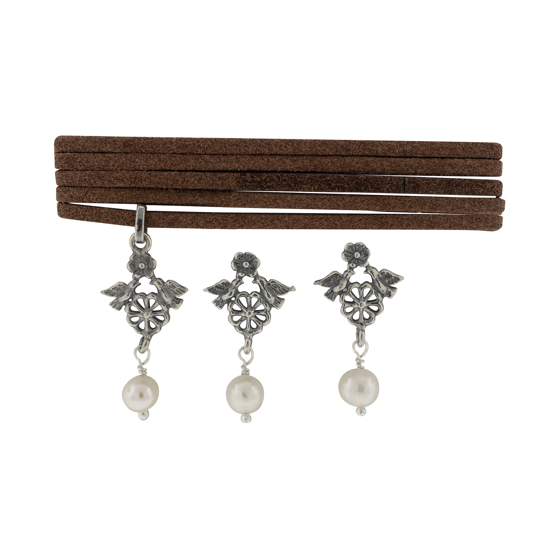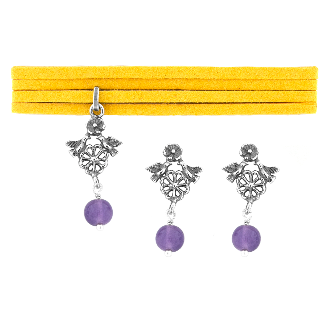 Juego de aretes de poste y dije de flor margarita y pajaritos