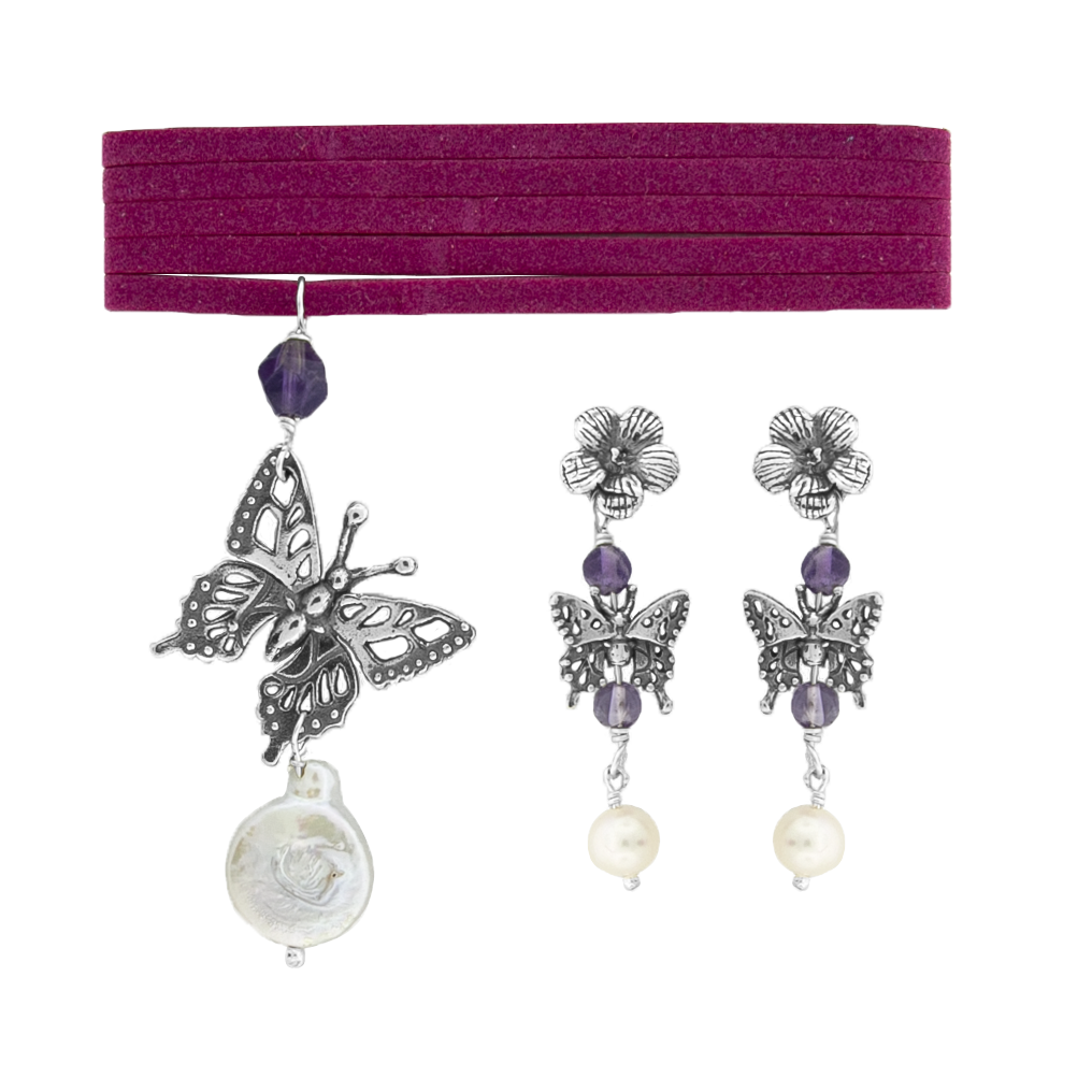 Juego aretes y dije de plata en forma de mariposa con piedra natural colgando.