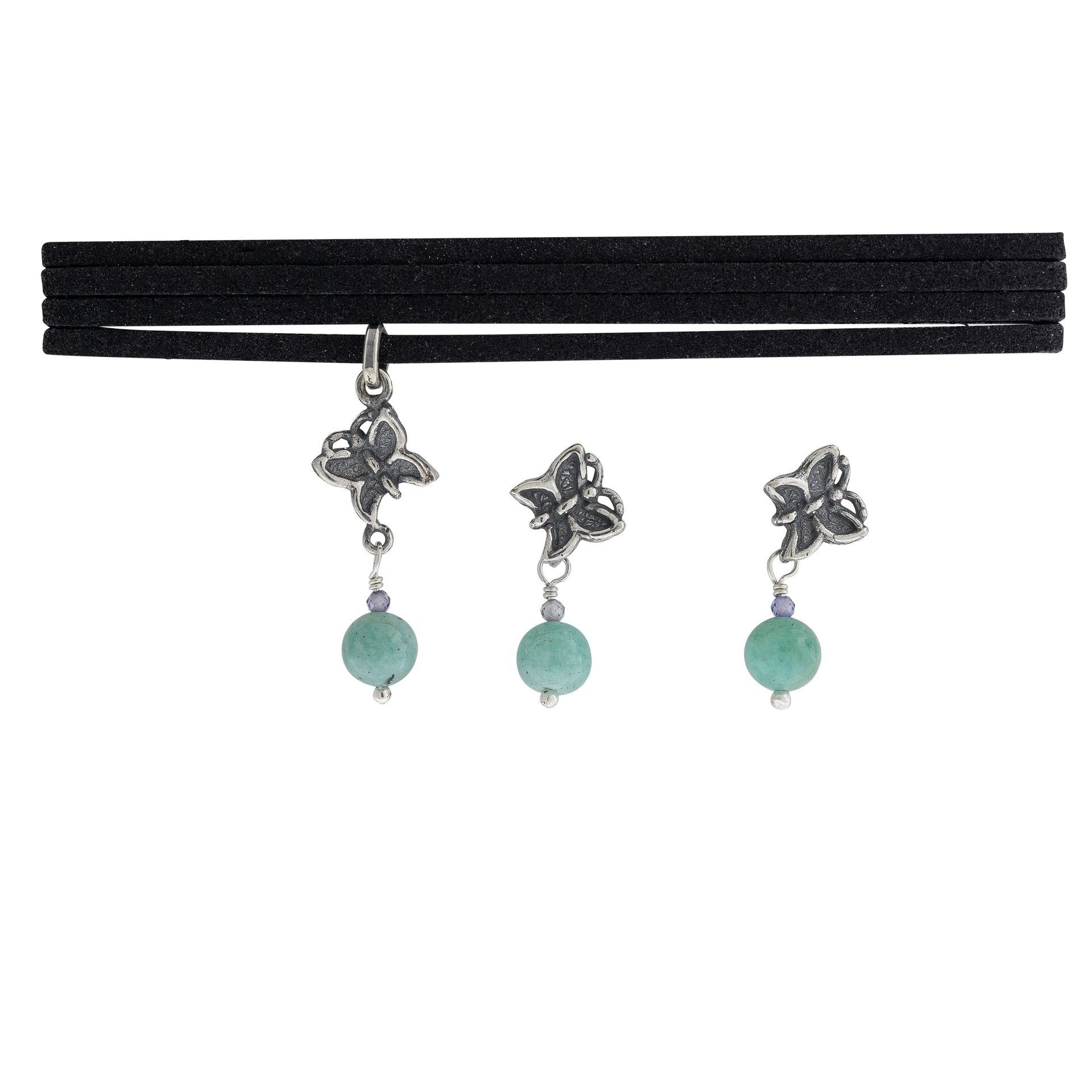 Juego de aretes de poste y dije de maripositas con piedras naturales colgando.