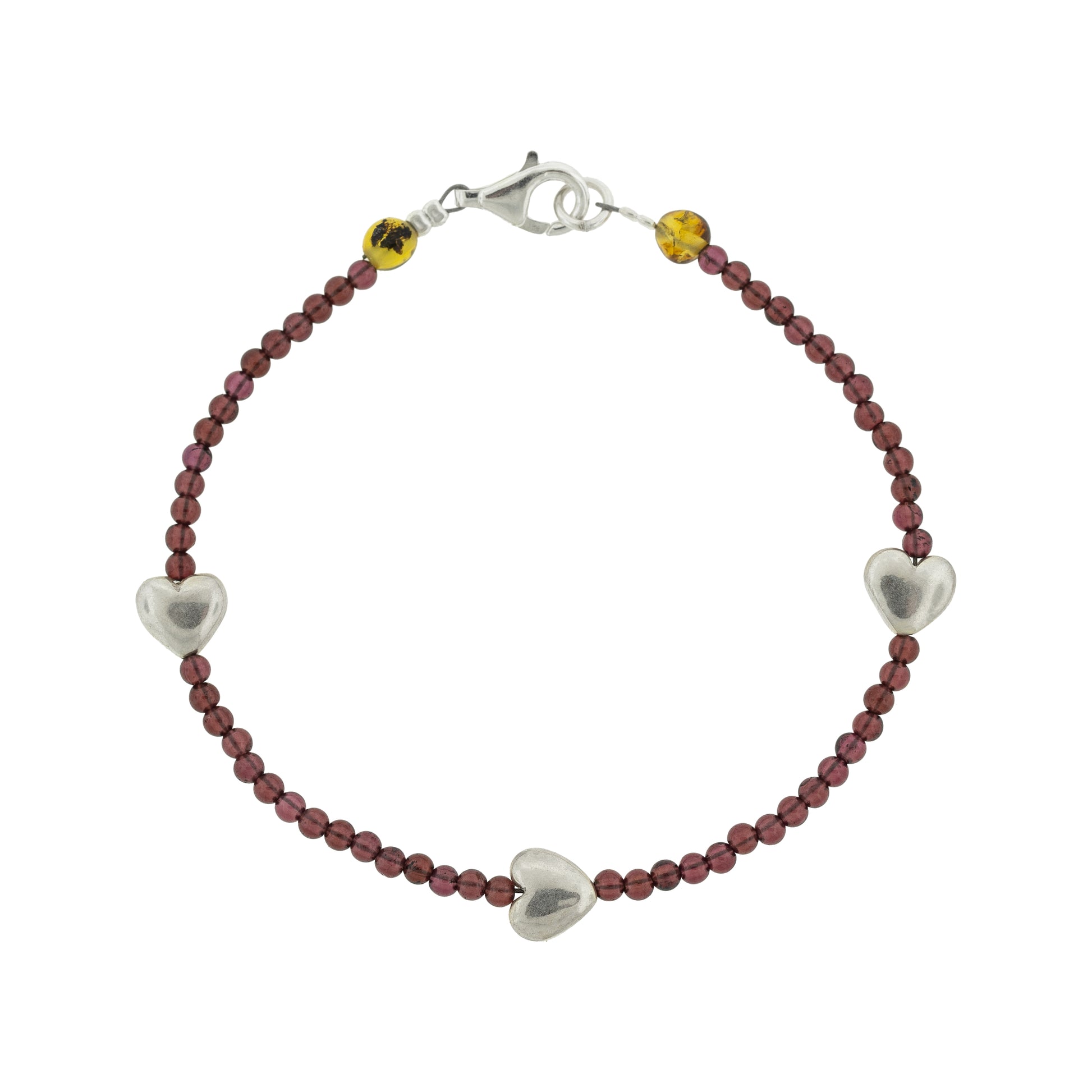 Tres pequeños corazones de plata adornan esta pulsera de pequeñas piedritas de coral en color rojo. ¿Ya pensaste qué símbolo llevará cada uno?
