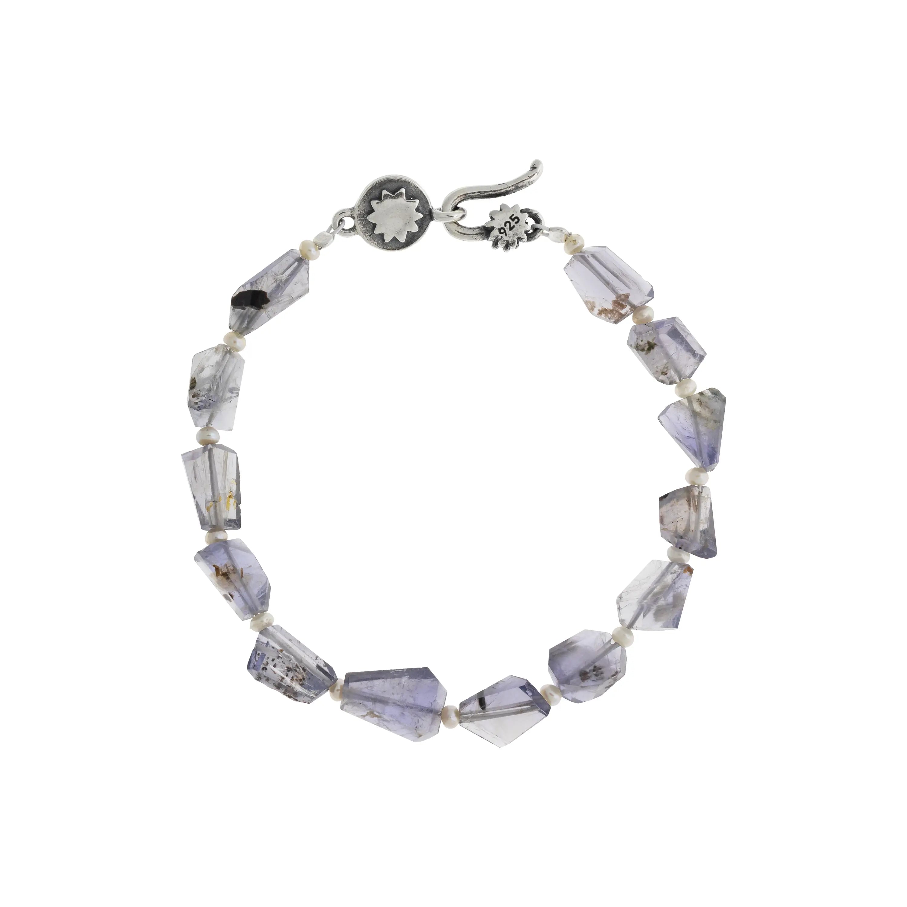 La iolita es conocida como la piedra de la orientación interna. Los antiguos navegantes la usaban para intuir la posición del sol en días nublados. Su tono azul profundo —entre violeta y gris— tiene algo de marea tranquila, como una mirada que se serena antes de decidir. Esta pulsera acompaña ese gesto silencioso: respirar, mirar hacia adentro y seguir con claridad.
