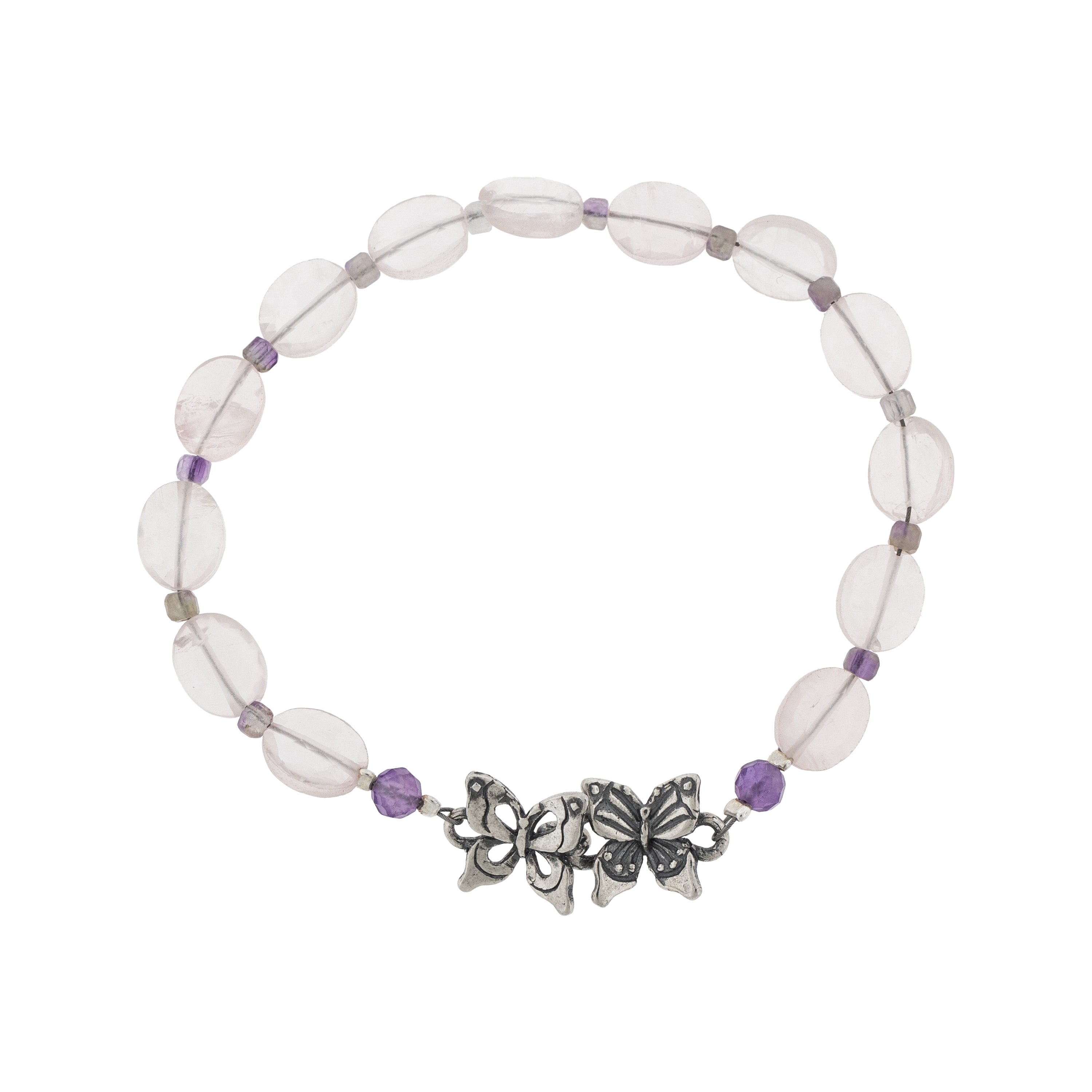 Mariposas de plata formando el broche de la pulsera con cuarzo rosa y amatista.