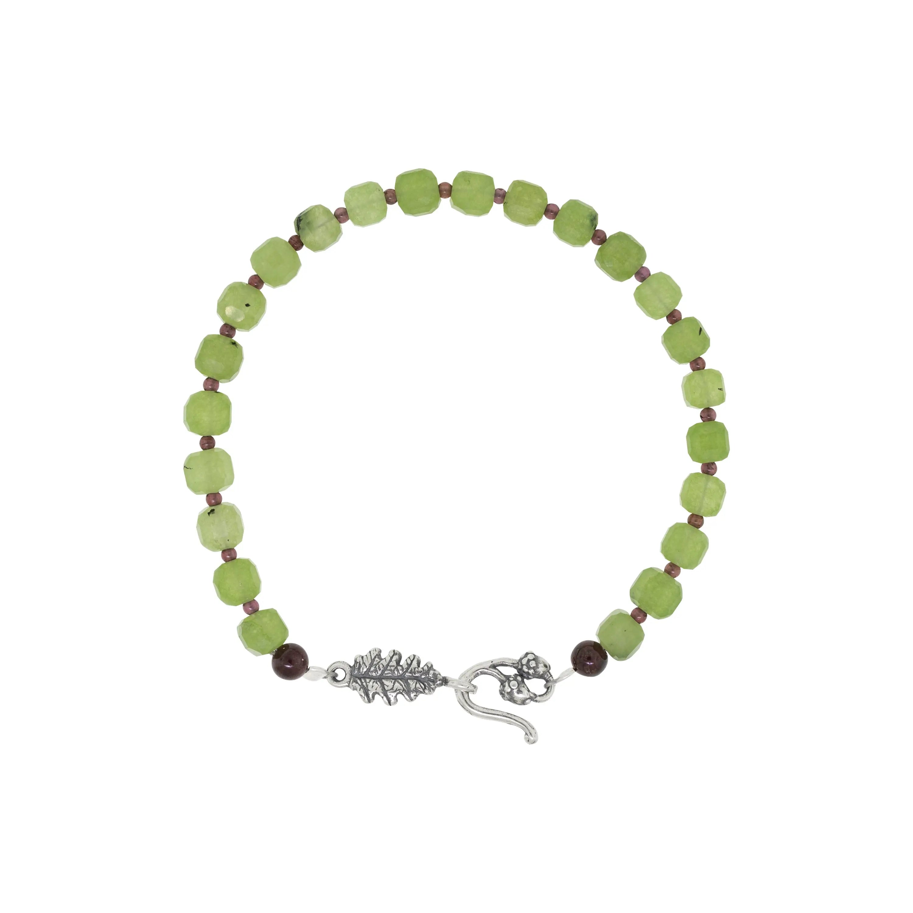 La preservación de los bosques depende de que juntos los cuidemos. Conviértete en embajador de ese poderoso mensaje con esta pulsera con la hojita de roble y sus bellotas hechas de plata 925 acompañadas de jade y pequeños granates.